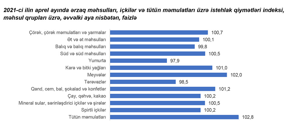 2021-ci ilin aprel ayında ərzaq məhsulları, içkilər və tütün məmulatları üzrə istehlak qiymətləri indeksi əvvəlki aya nisbətən 0,4 faiz, əvvəlki ilin aprel ayına nisbətən 4,4 faiz artıb.