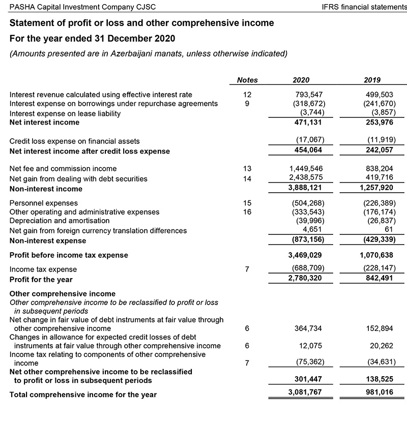 Marja Şirkətin maliyyə hesabatlarına istinadən xəbər verir ki, 2020-ci ildə "PAŞA Kapital"ın faiz gəlirləri 794 min manat, qeyri-faiz gəlirləri isə 3 milyon 888 min manat təşkil edib. 2019-cu ildə "PAŞA Kapital"ın faiz gəlirləri 500 min manat, qeyri-faiz gəlirləri isə 1 milyon 258 min manat təşkil etmişdi.