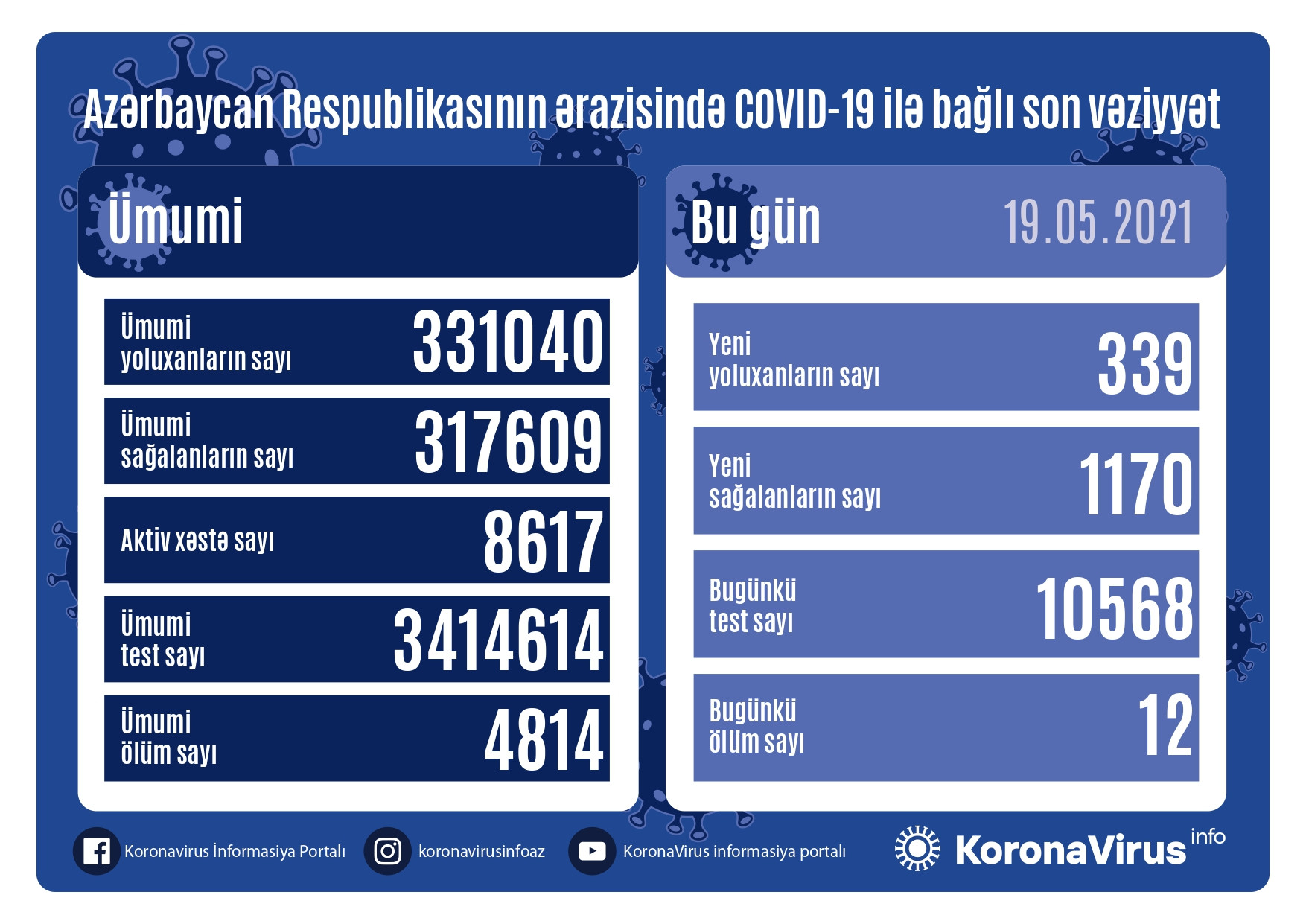 Azərbaycanda bu gün koronavirus infeksiyasına 339 yeni yoluxma faktı qeydə alınıb, 1170 nəfər müalicə olunaraq sağalıb və evə buraxılıb.