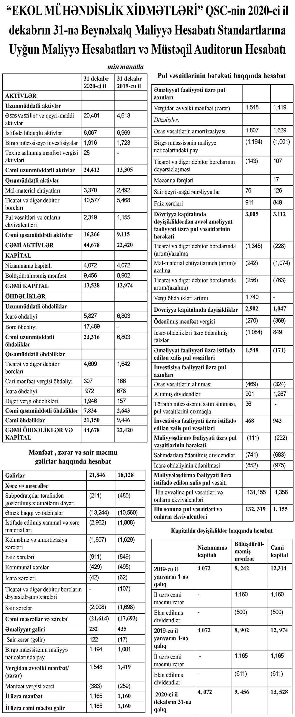 Birgə müəssisənin maliyyə nəticələrində pay hesabına “Ekol Mühəndislik Xidmətləri”nin mənfəəti artıb. Ötən il şirkət birgə müəssisənin maliyyə nəticələrindən 1 milyon 194 min manat pay alıb (2019-da 1 milyon 1 min manat)