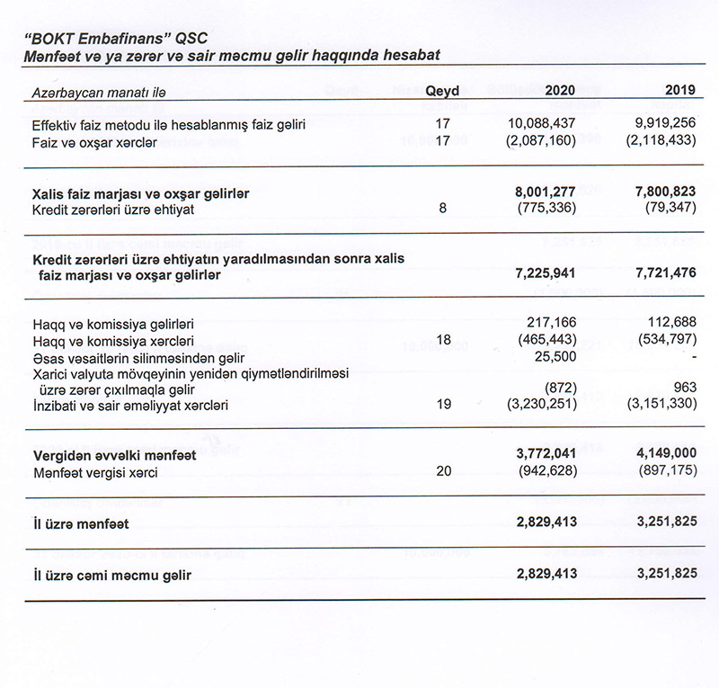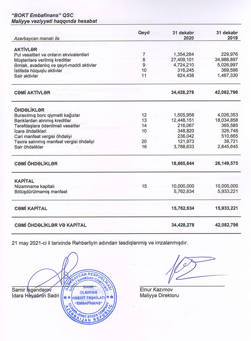 Bank Olmayan Kredit Təşkilatı “Embafinans” QSC Beynəlxalq Maliyyə Hesabatları Standartlarına uyğun 2020-ci il üzrə maliyyə nəticələrini açıqlayıb.