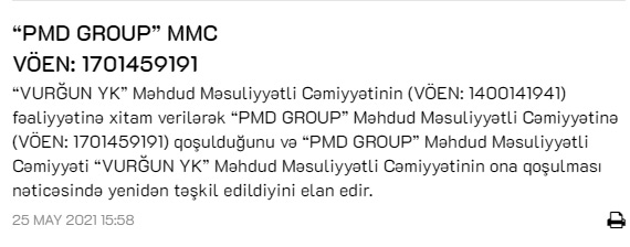 “PMD Group” MMC, “Vurğun YK” Məhdud Məsuliyyətli Cəmiyyətinin fəaliyyətinə xitam verilərək “PMD GROUP” Məhdud Məsuliyyətli Cəmiyyətinə qoşulduğunu elan edib.
