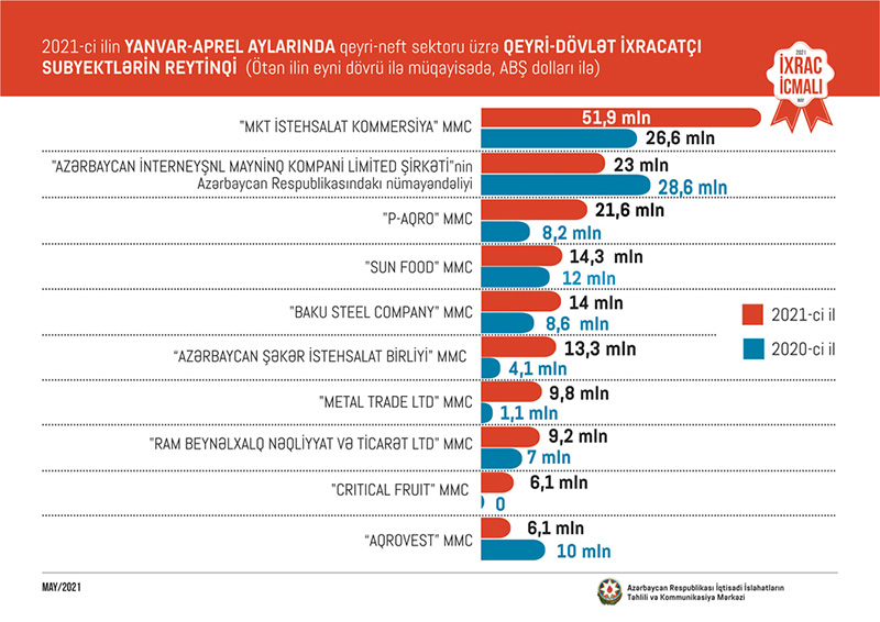 Marja İcmala istinadən xəbər verir ki, 2021-ci ilin yanvar-aprel ayları üzrə hazırlanan qeyri-dövlət ixracatçı subyektlərin reytinqində ilk onluqda aşağıdakı şirkətlər təmsil olunurlar: