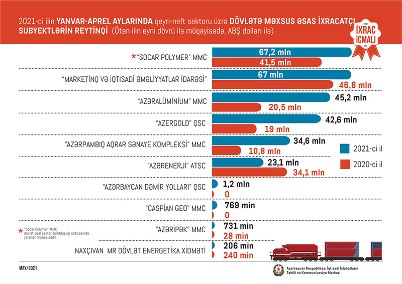 Qeyri-neft sektoru üzrə ixrac əməliyyatlarında iştirak edən dövlətə məxsus olan şirkətlərin siyahısına isə “Socar Polymer” MMC və Azərbaycan Respublikası Dövlət Neft Şirkətinin “Marketinq və İqtisadi Əməliyyatlar İdarəsi” başçılıq edir. Daha sonra bu siyahıda aşağıdakı şirkətlər təmsil olunurlar: "Azəralüminium" MMC, "Azergold" QSC, "Azərpambıq Aqrar Sənaye Kompleksi" MMC, "Azərenerji" ATSC, "Azərbaycan Dəmir Yolları" QSC, "Caspian Geo" MMC, "Azəripək" MMC, Naxçıvan MR Dövlət Energetika Xidməti.