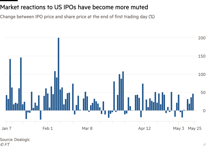 Refinitiv analitika şirkətinin məlumatına görə, ilin əvvəlində ABŞ-da IPO-ya çıxan hər dörd şirkətdən biri (təxminən 25%) gözlənildiyindən daha baha qiymət qoyurdusa, ikinci rübdə bu rəqəm 11%-ə düşüb. Şirkətlərin 13%-i isə ilk treydinq günündə səhmlərini proqnozdan daha ucuz satır.