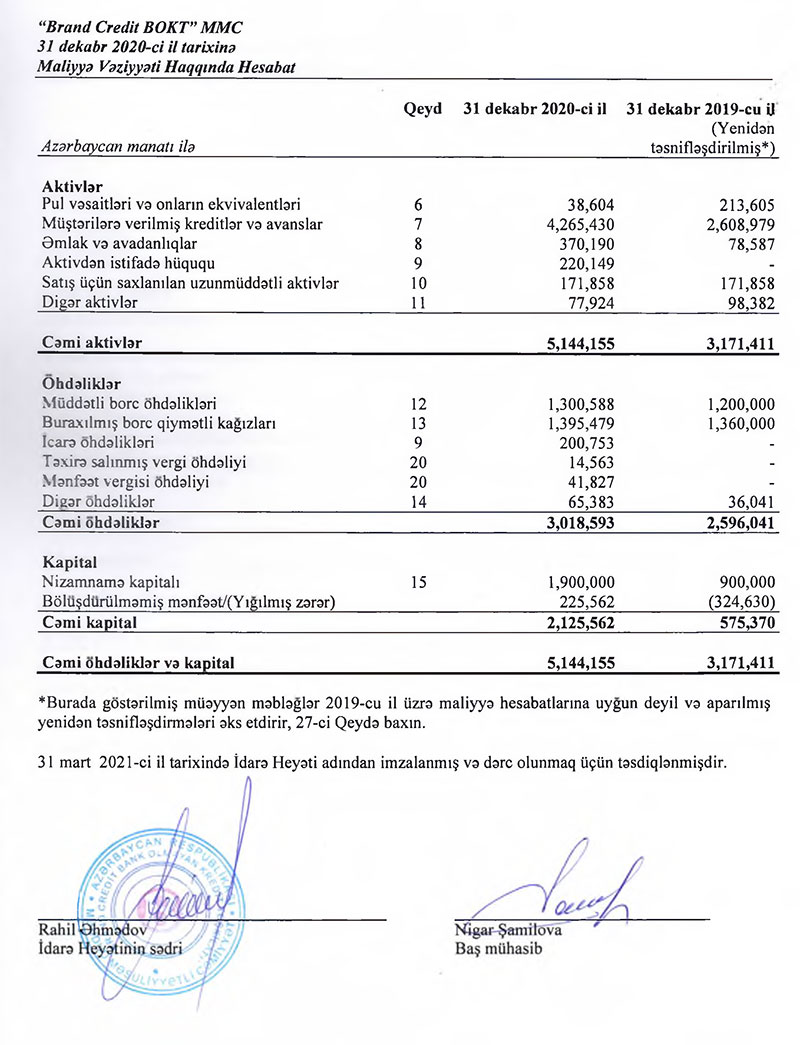 Hesabat dövründə “Brand Credit”in öhdəlikləri 16,3% artaraq 3 milyon 19 min manata, balans kapitalı isə 3,7 dəfə artaraq 2 milyon 126 min manata, o cümlədən nizamnamə kapitalı 2,1 dəfə artaraq 1,9 milyon manata çatıb.