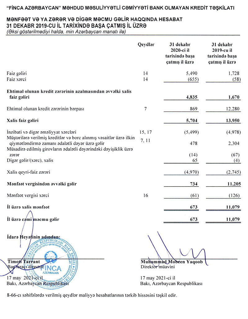 “FINCA Azerbaijan” MMC bank olmayan kredit təşkilatı (BOKT) 2020-ci ili 673 min manat xalis mənfəətlə başa vurub.