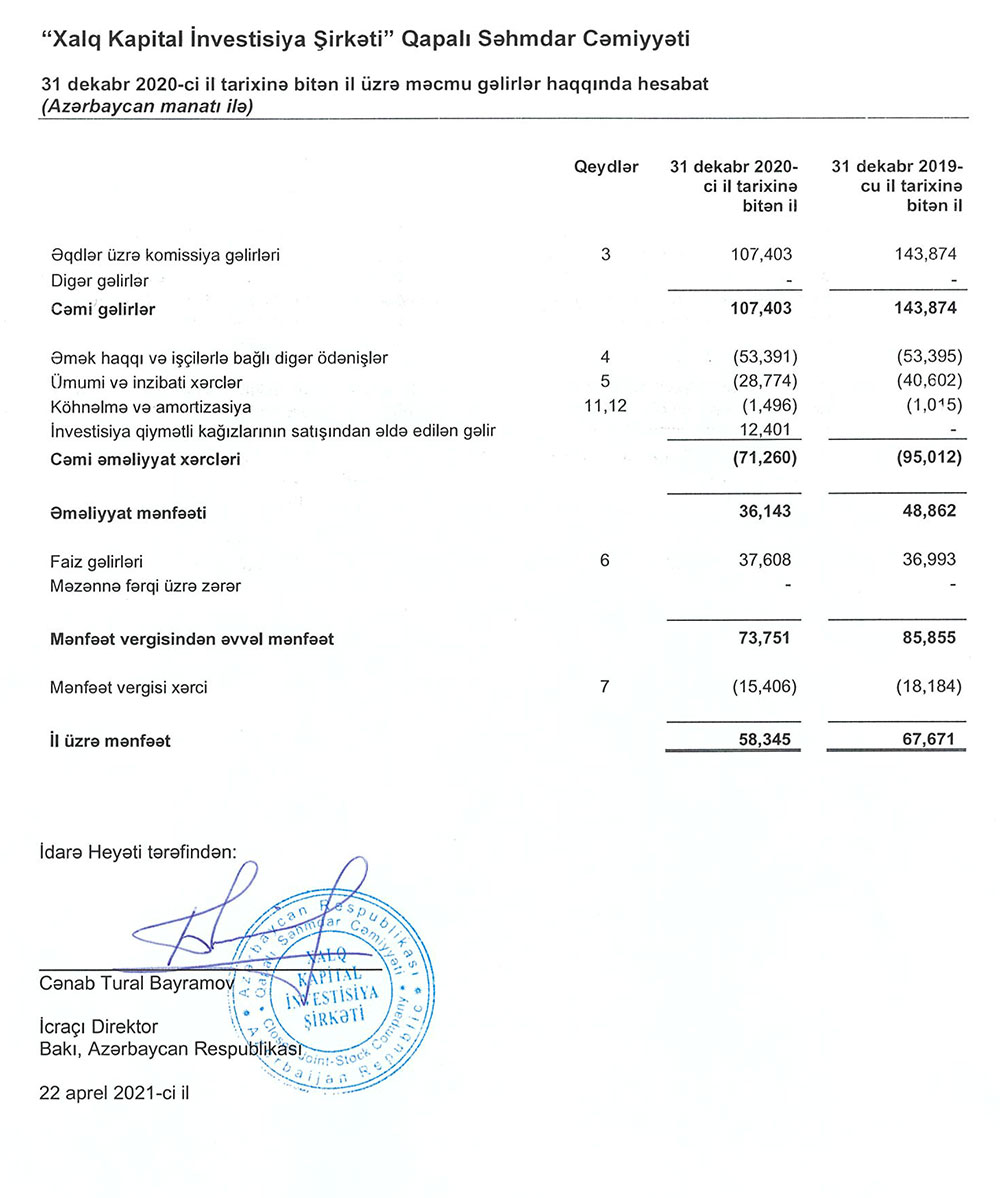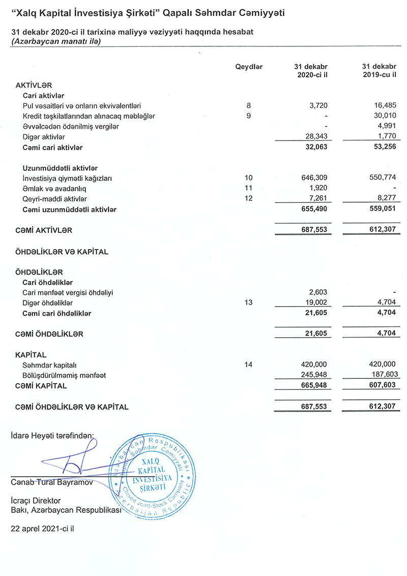 “Xalq Kapital İnvestisiya Şirkəti” QSC 2020-ci ili 58 min manat xalis mənfəətlə başa vurub.