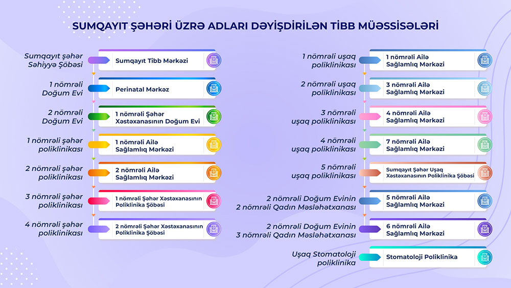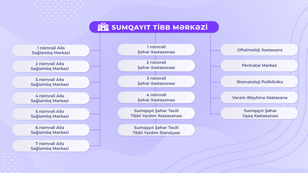 Bundan başqa, Sumqayıt şəhər Səhiyyə Şöbəsinin bazasında yeddisi Ailə Sağlamlıq Mərkəzi və dördü şəhər xəstəxanası olmaqla 18 tibb müəssisəsindən ibarət Sumqayıt Tibb Mərkəzi yaradılıb.