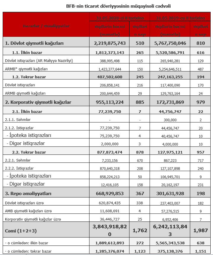 2021-ci ilin yanvar-may ayları ərzində Bakı Fond Birjasında qiymətli kağızlar üzrə keçirilən əməliyyatların ümumi həcmi 6 milyard 871 milyon 122 min 750 manat təşkil etmişdir. Əməliyyatların böyük hissəsi dövlət qiymətli kağızları (Maliyyə Nazirliyinin istiqrazları və Mərkəzi Bankın notları) ilə bağlıdır.