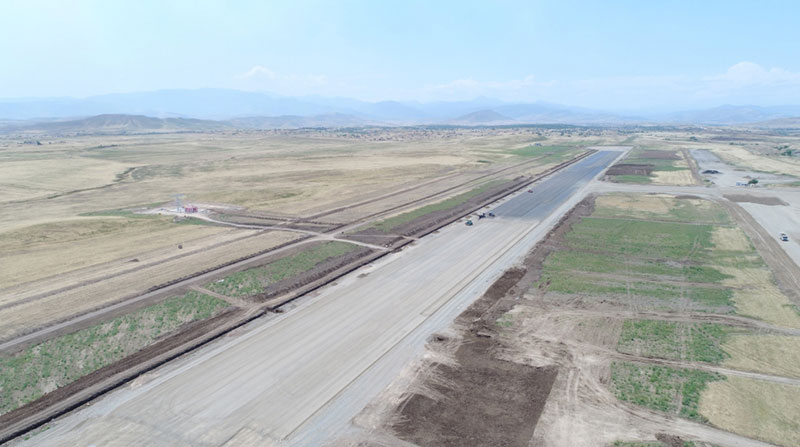 “AzVirt” MMC-nin baş direktoru Kamil Əliyev: Cənab Prezident, Füzuli Beynəlxalq Hava Limanının tikintisinə yanvar ayında başlanmışdır. Bu plakatda 3 min metr uzunluğunda, 60 metr enində uçuş-enmə zolağı əks olunub. Təyyarələrin enişi iki tərəfdən də təmin olunur. Bu günə biz uçuş-enmə zolağının və perronun tikintisində torpaq işlərini bitirmişik. İndi biz yol geyiminin tikintisi ilə məşğuluq.