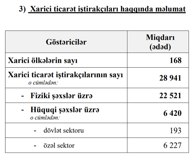 Azərbaycanda 6400-dən şirkət xarici ticarət iştirakçısıdır.Dövlət Gömrük Komitəsi xarici ticarət iştirakçıları haqqında məlumatları açıqlayıb.
