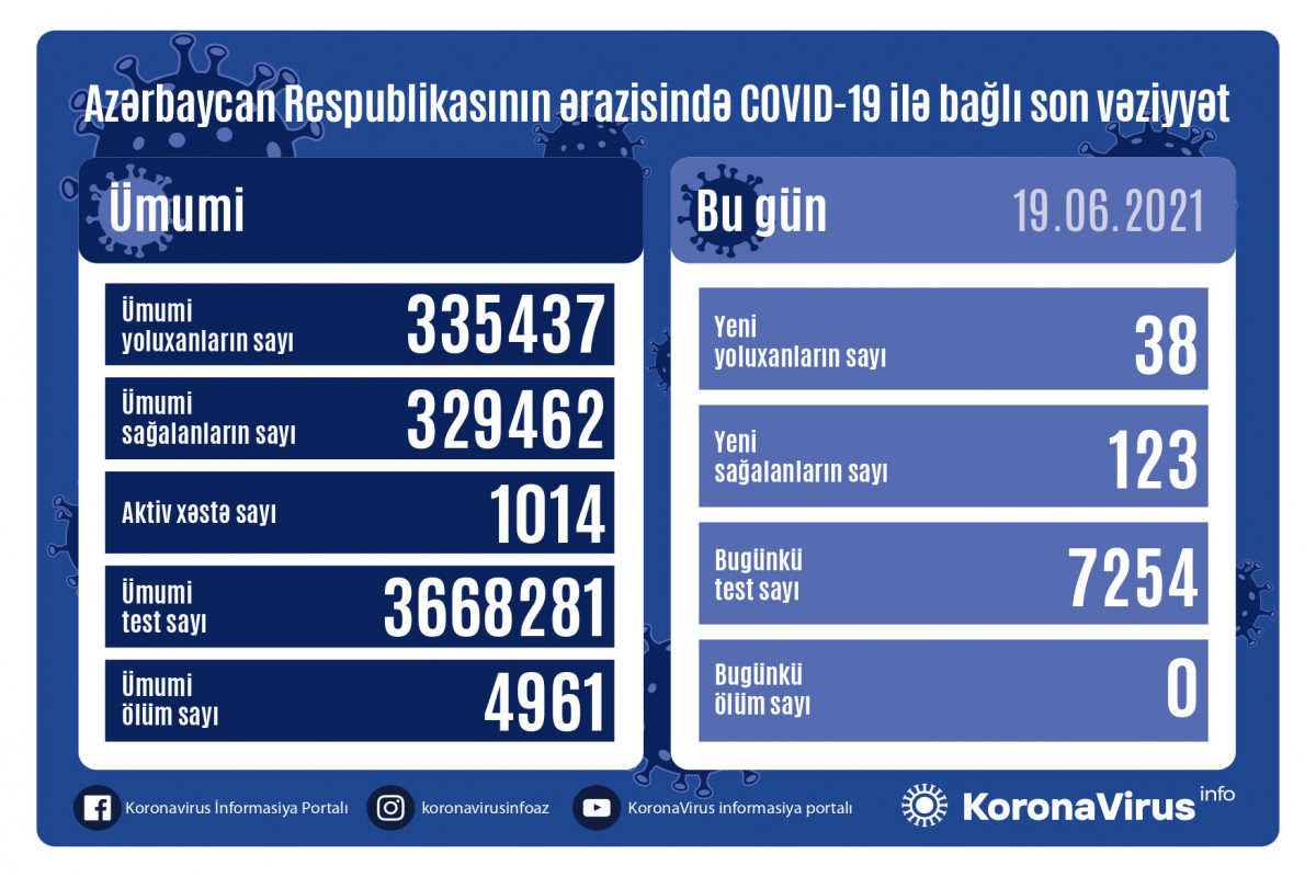 Azərbaycan Respublikasında koronavirus (COVID-19) infeksiyasına 38 yeni yoluxma faktı qeydə alınıb, 123 nəfər müalicə olunaraq sağalıb.