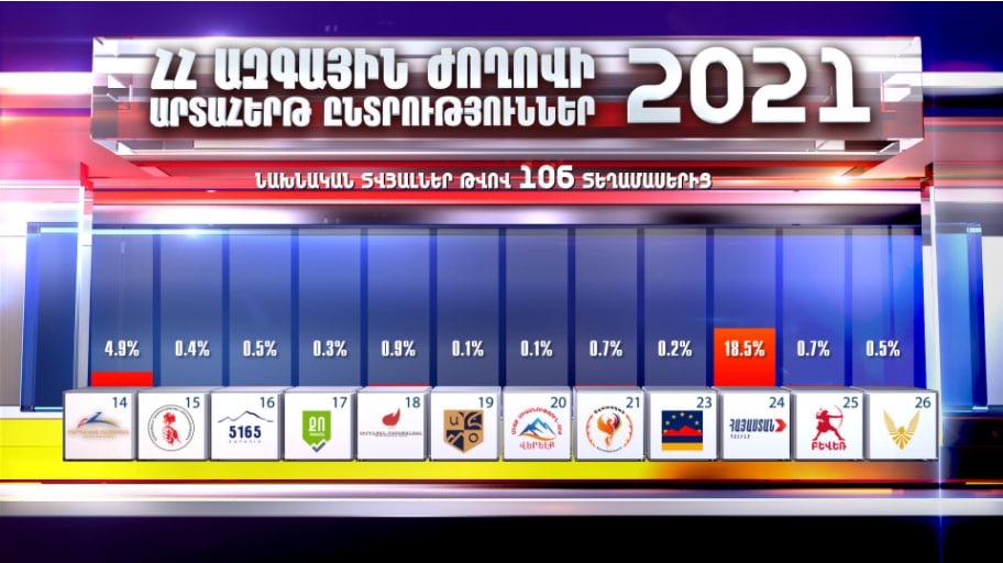 Paşinyanın partiyası öndədirErmənistanın baş naziri vəzifəsini icra edən Nikol Paşinyanın rəhbərlik etdiyi “Vətəndaş müqaviləsi” partiyası 58,04% səslə liderlik edir, sabiq prezident Robert Koçaryanın rəhbərlik etdiyi “Ermənistan” bloku 22,01% səslə ikinci yerdədir.