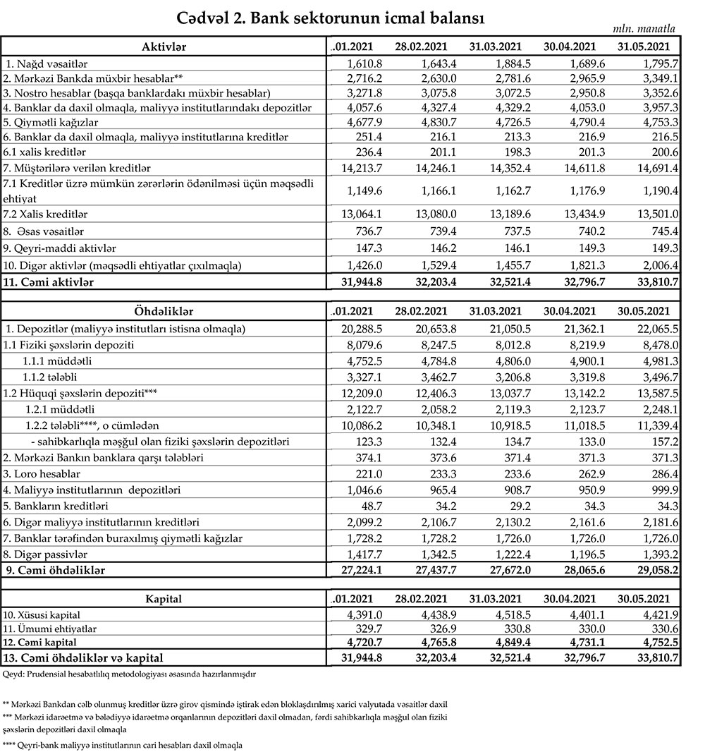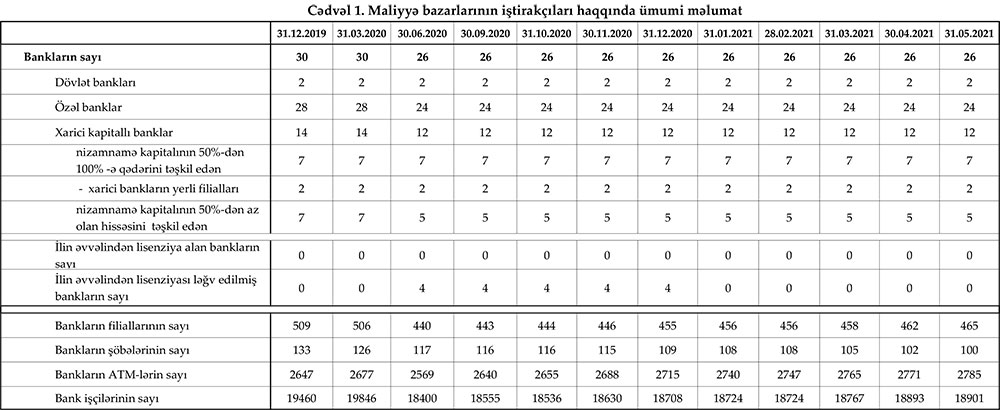 Mərkəzi Bank 31 may 2021-ci il tarixinə olan bank sektorunun əsas göstəricilərini açıqlayıb.