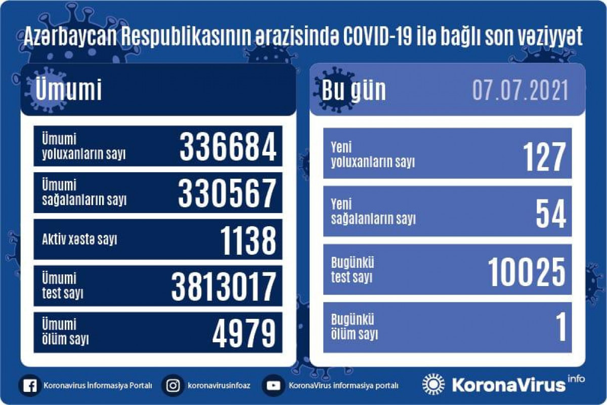 Azərbaycan Respublikasında koronavirus (COVID-19) infeksiyasına 127 yeni yoluxma faktı qeydə alınıb, 54 nəfər müalicə olunaraq sağalıb.
