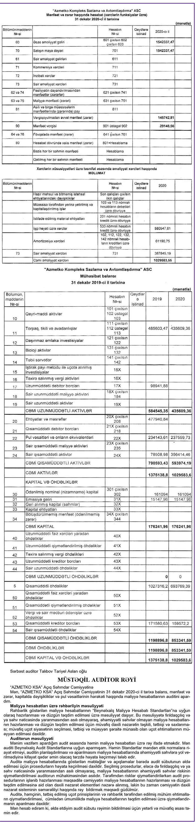 Neft-qaz sənayesində istehsal proseslərinin avtomatlaşdırılması sferasında xidmətlər göstərən “Azmetko Kompleks Sazlama və Avtomatlaşdırma” ASC 2020-ci ili 116 min 594 manat xalis mənfəət ilə başa vurub.