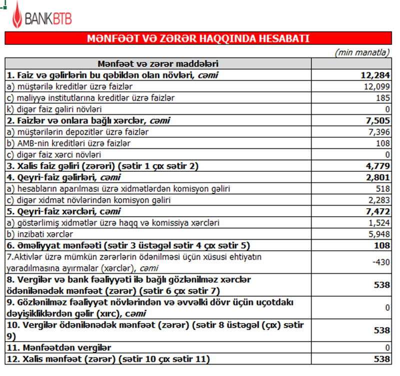Müqayisə üçün qeyd edək ki, 2020-ci ilin yanvar-iyun dövründə “Bank BTB”nin cəmi əməliyyat gəlirləri 15 milyon 552 min amant, cəmi əməliyyat xərcləri 14 miylon 640 min manat, əməliyyat mənfəəti 912 min manat təşkil etmişdi. Bank aktivlər üzrə mümkün zərərlərin ödənilməsi üçün xüsusi ehtiyatın yaradılmasına 1 milyon 19 min manat ayırdığından həmin dövrü 107 min manat xalis zərər ilə bağlamışdı.