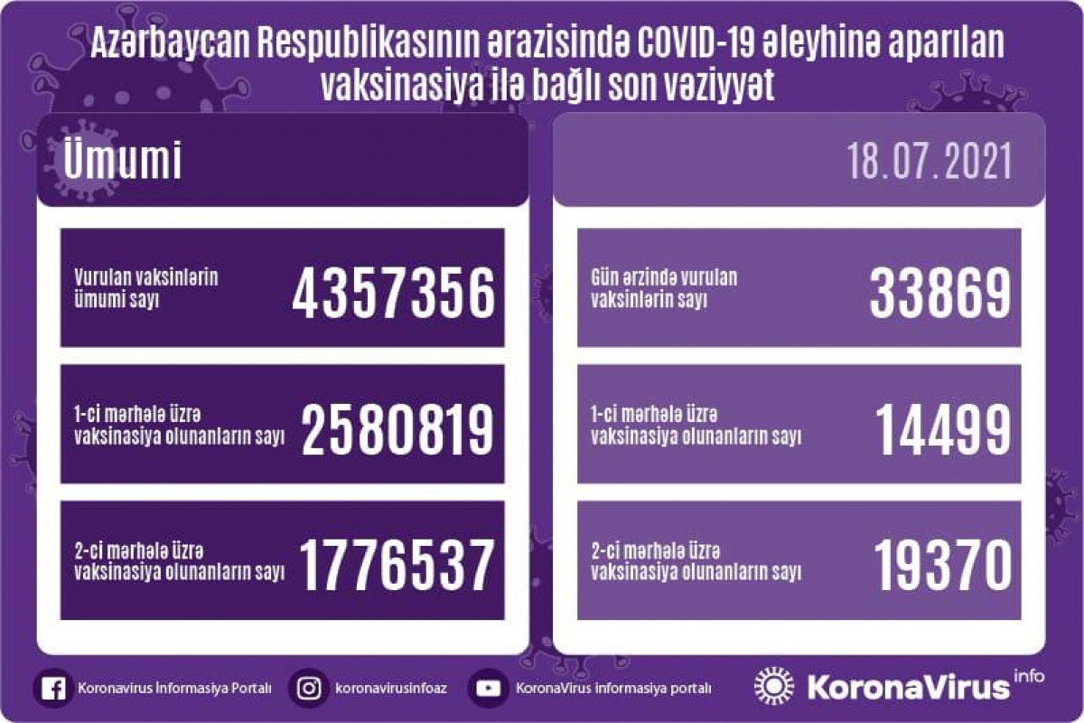 Azərbaycanda son sutkada koronavirus (COVID-19) əleyhinə 33 869 vaksin vurulub.