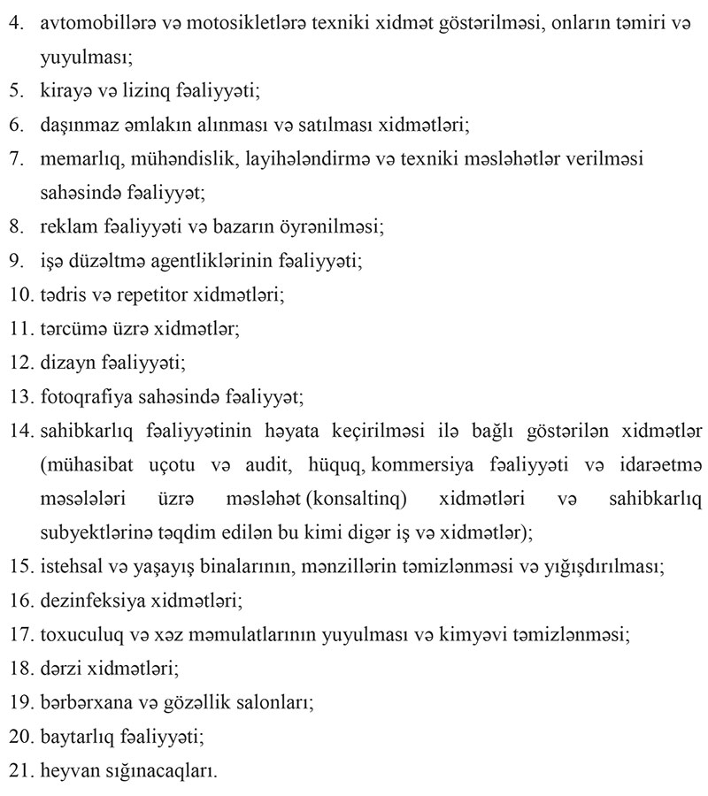 - bu Qərarın əlavəsində qeyd olunan iş və xidmət sahələrində fəaliyyət göstərən müəssisələr;