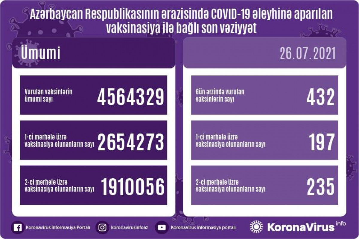 Azərbaycanda son sutkada koronavirus (COVID-19) əleyhinə 432 vaksin vurulub.
