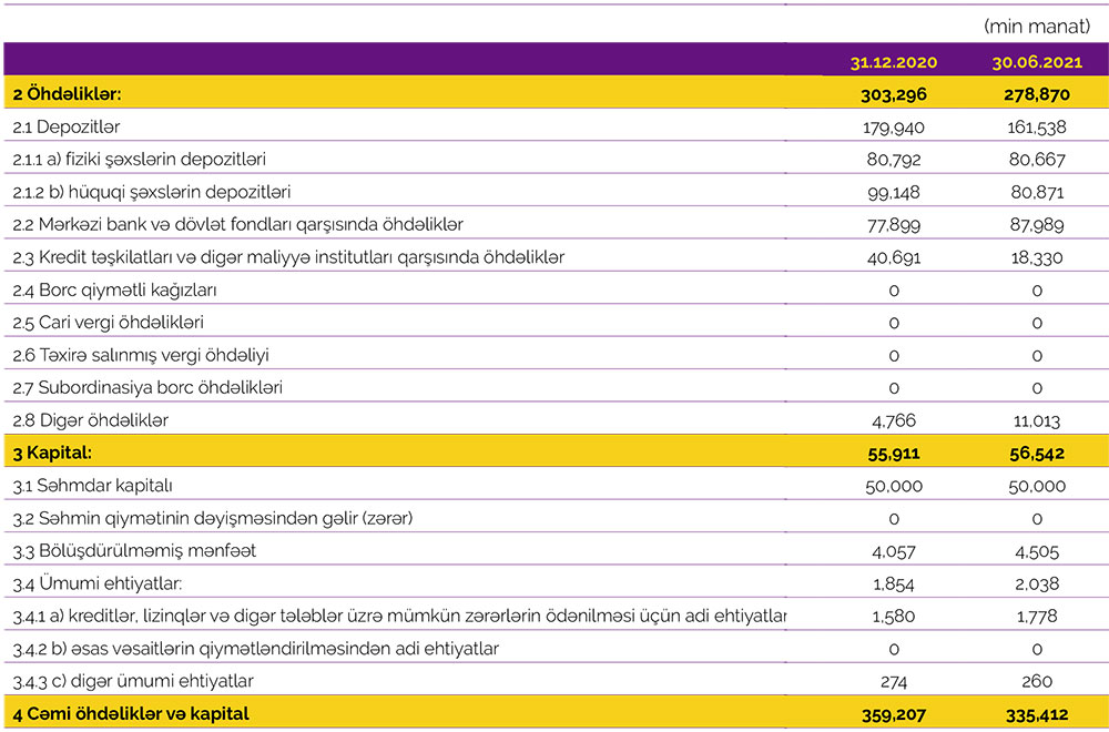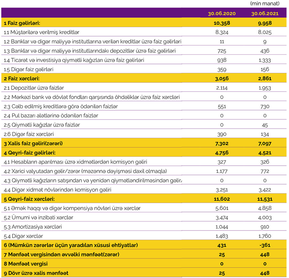 Müqayisə üçün qeyd edək ki, 2020-ci ilin ilk yarısında Azər-Türk Bankın cəmi əməliyyat gəlirləri 15 milyon 114 min manat, cəmi əməliyyat xərcləri 14 milyon 658 min manat, gəlirlər xərcləri üstələdiyindən əməliyyat mənfəəti 456 min manat təşkil etmişdi. Bank mümkün zərərlər üçün yaradılan xüsusi ehtiyatlara 431 min manat ayırdığından həmin dövrü 25 min manat xalis mənfəət ilə bağlamışdı.