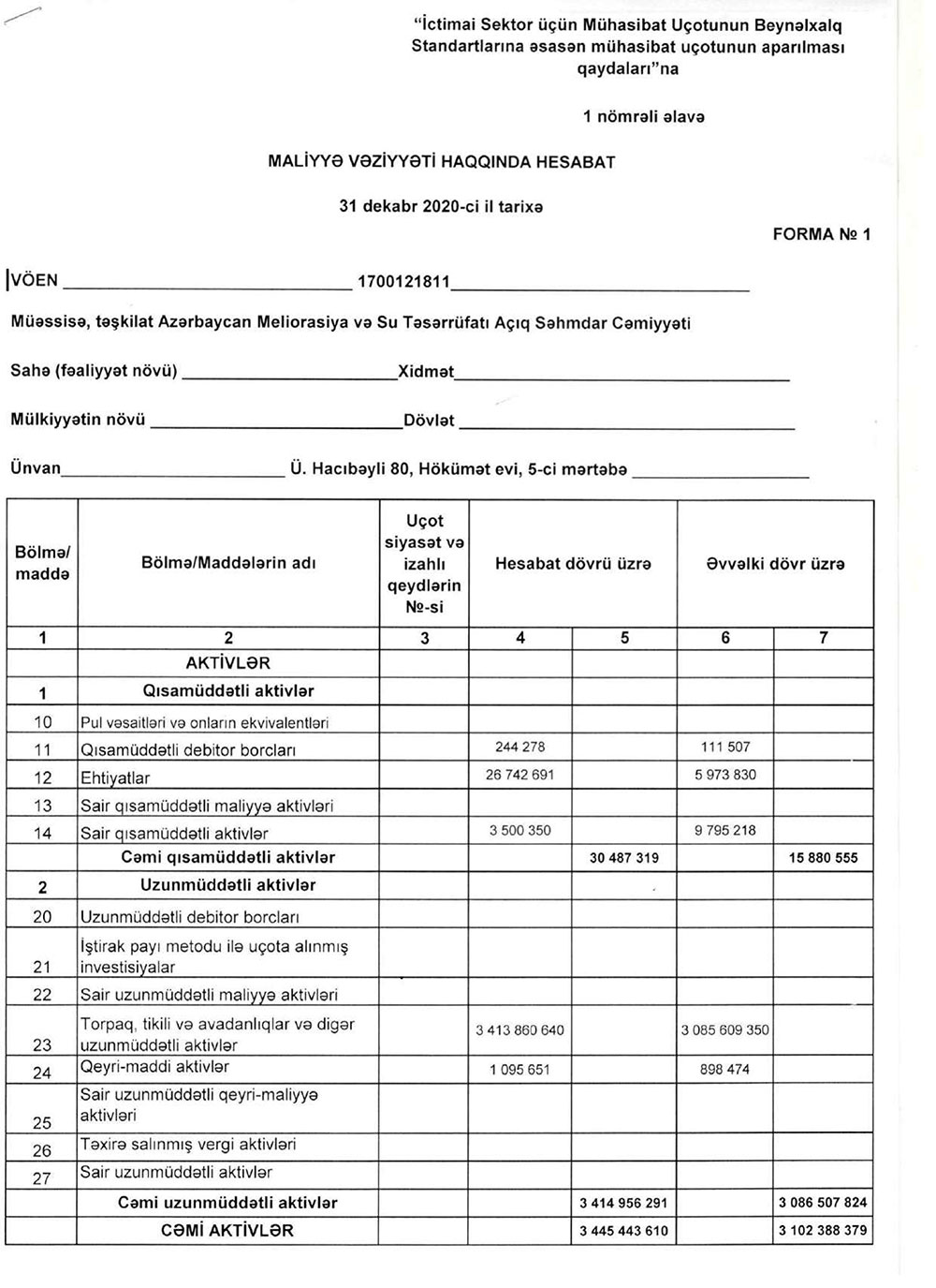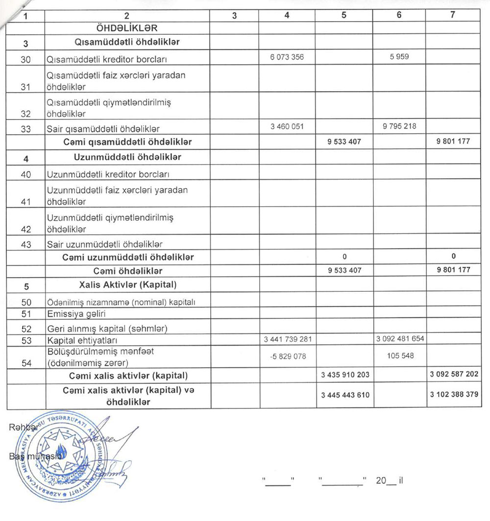 Bu il yanvarın 1-nə “Azərbaycan Meliorasiya və Su Təsərrüfatı”nın aktivləri 3 milyard 445 milyon 444 min manat olub ki, bu da 1 il əvvələ nisbətən 11,1% çoxdur. Hesabat dövründə səhmdar cəmiyyətinin öhdəlikləri 2,7% azalaraq 9 milyon 533 min manata düşüb, balans kapitalı isə 11,1% artaraq 3 milyard 435,91 milyon manata çatıb.