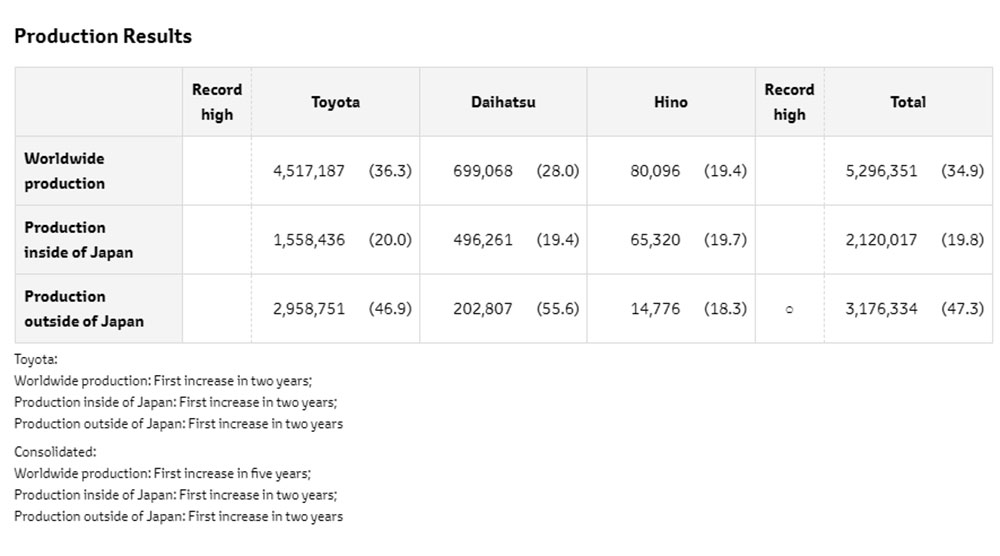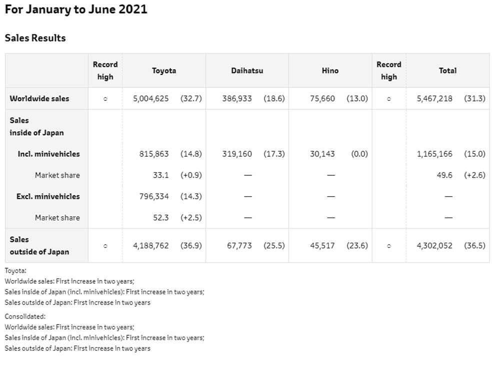 2021-ci ilin ilk yarısında Yaponiyanın avtomobil istehsalçısı Toyota Motor, törəmə şirkətləri Daihatsu Motor və Hino Motors 5 milyon 467 min 218 ədəd yeni avtomobil, avtobus və yük maşını satıb. Bu, 2020-ci ilin eyni dövründəkindən 31,3% çoxdur.