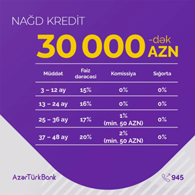 Kampaniya ərzində 3 aydan 48 ay müddətinədək rəsmiləşdirilən kreditlərin illik faiz dərəcəsi 15%-dən başlayır.