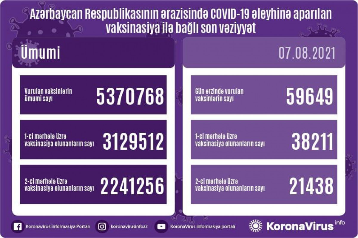 Ölkədə vurulan vaksinlərin ümumi sayı 5370768, birinci mərhələ üzrə vaksinasiya olunanların ümumi sayı 3129512, ikinci mərhələ üzrə vaksinasiya olunanların sayı isə 2241256 təşkil edir.