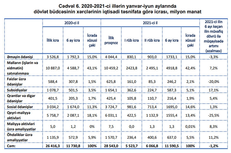 İqtisadi təsnifata görə 2021-ci ilin yanvar-iyun aylarında dövlət büdcəsinin xərclərinin icrasında ən çox payı 42,4 faiz və ya 4 milyard 918,8 milyon manat malların (işlərin və xidmətin) satınalınması, 15 faiz və ya 1 milyard 733,1 milyon manat əməyin ödənişi xərcləri, 14,6 faiz və ya 1 milyard 695 milyon manat sosial ödəniş xərcləri, 13,4 faiz və ya 1 milyard 555,4 milyon manat qeyri-maliyyə aktivləri xərcləri, ən az payı isə ümumilikdə 14,6 faiz və ya 1 milyard 668,2 milyon manat olmaqla faizlərin ödənişi, subsidiyalar, qrantlar, maliyyə aktivləri və öhdəliklər üzrə əməliyyat xərcləri təşkil etmişdir.
