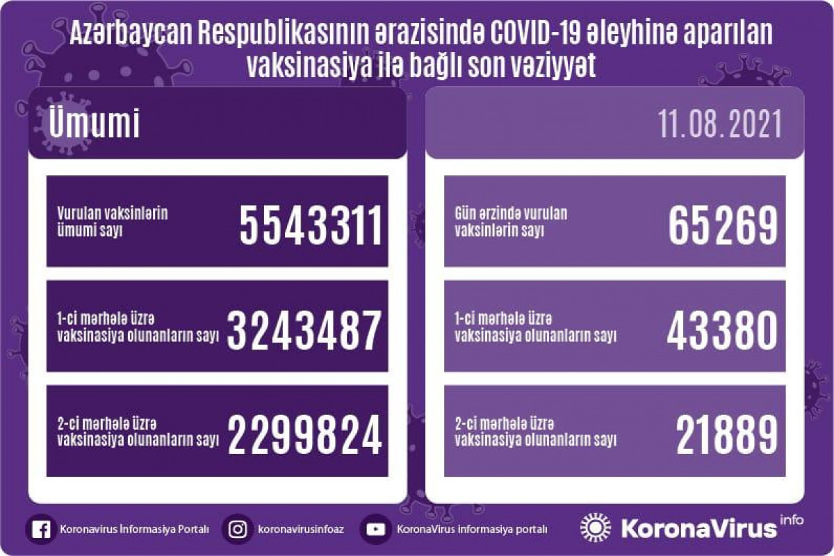 Azərbaycanda son sutkada koronavirus (COVID-19) əleyhinə 65269 vaksin vurulub.