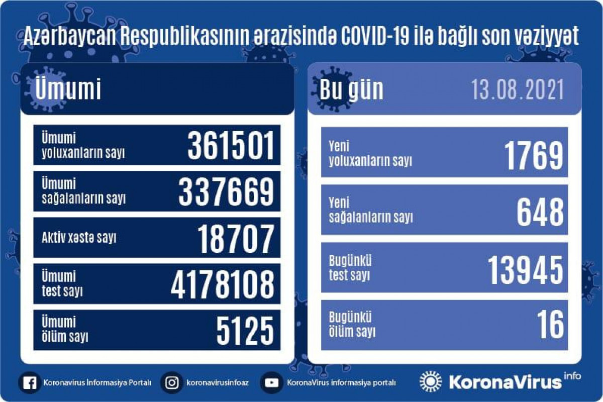 Azərbaycan Respublikasında koronavirus (COVID-19) infeksiyasına 1769 yeni yoluxma faktı qeydə alınıb, 648 nəfər müalicə olunaraq sağalıb.