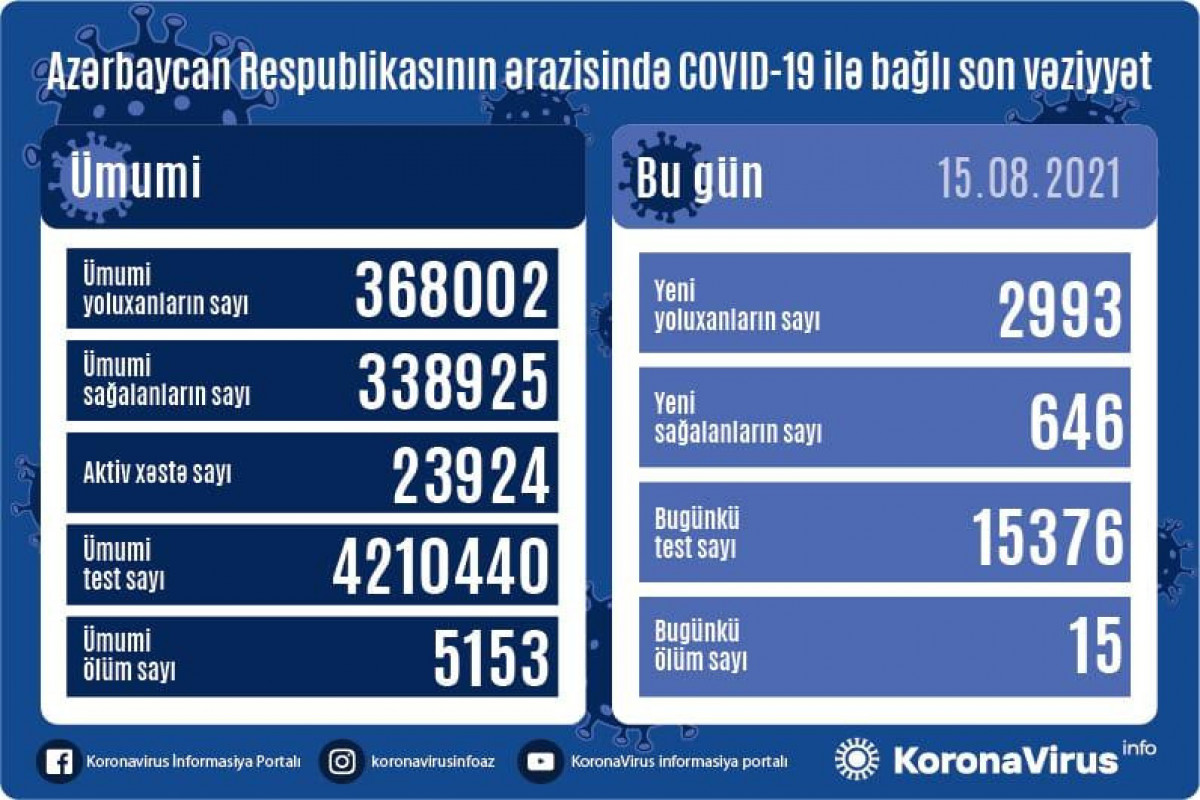 Azərbaycan Respublikasında koronavirus (COVID-19) infeksiyasına 2993 yeni yoluxma faktı qeydə alınıb, 646 nəfər müalicə olunaraq sağalıb.