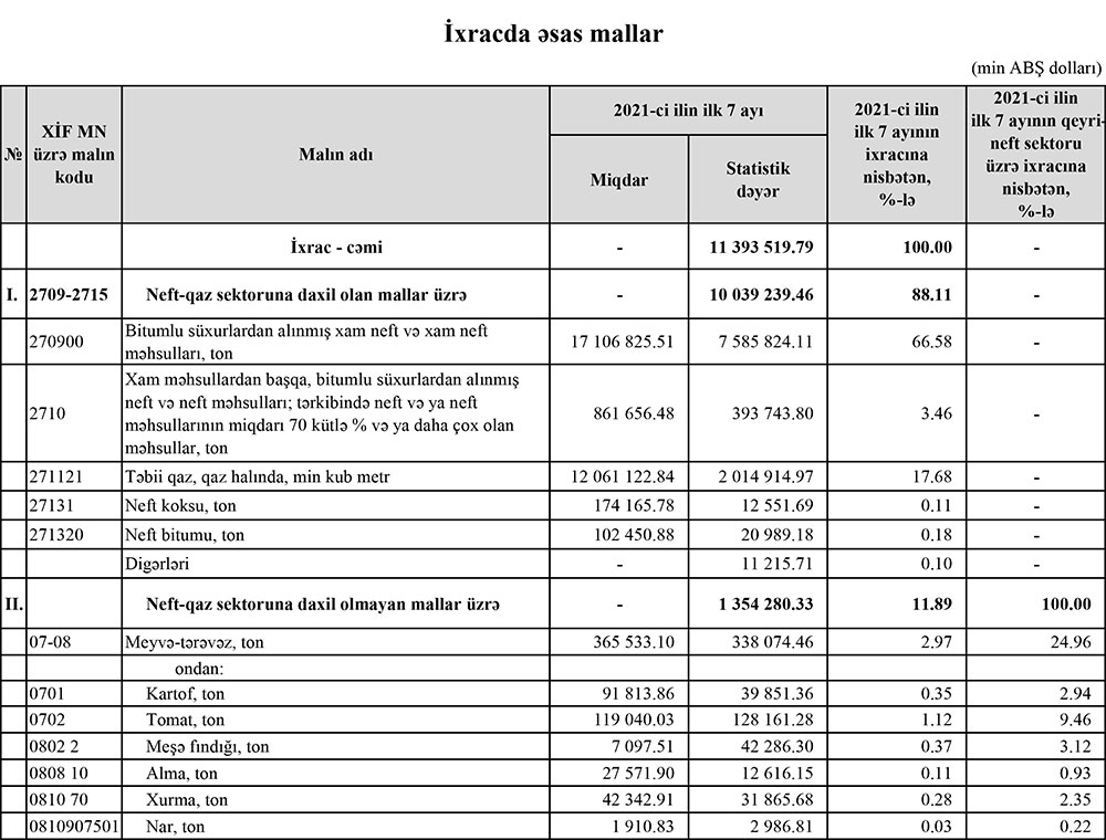 2021-ci ilin 7 ayı ərzində (yanvar-iyul) Azərbaycanın xarici ticarət əməliyyatlarının həcmi 17 milyard 691 milyon 469 min ABŞ dolları, o cümlədən idxal 6 milyard 297 milyon 949 min ABŞ dolları, ixrac 11 milyard 393 milyon 520 min ABŞ dolları, saldo 5 milyard 95 milyon 570 min ABŞ dolları təşkil edib.