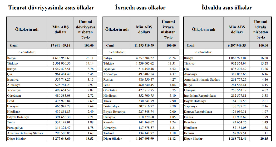 Marja Dövlət Gömrük Komitəsinə istinadən xəbər verir ki, Rusiya ilə ticarətdə mənfi saldo 576 milyon 372 min dollar olub.