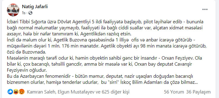 Bu da Azərbaycan fenomenidir - bütün məmur, deputat, nazir uşaqları doğuşdan bacarıqlı biznesmen olurlar, həmişə tenderləri udurlar, bu "sirri" İskoç Bilim Adamları da çözə bilməz”.