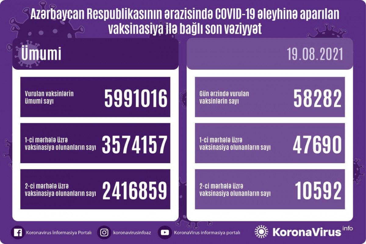 Ölkədə vurulan vaksinlərin ümumi sayı 5991016, birinci mərhələ üzrə vaksinasiya olunanların ümumi sayı 3574157, ikinci mərhələ üzrə vaksinasiya olunanların sayı isə 2416859 təşkil edir.