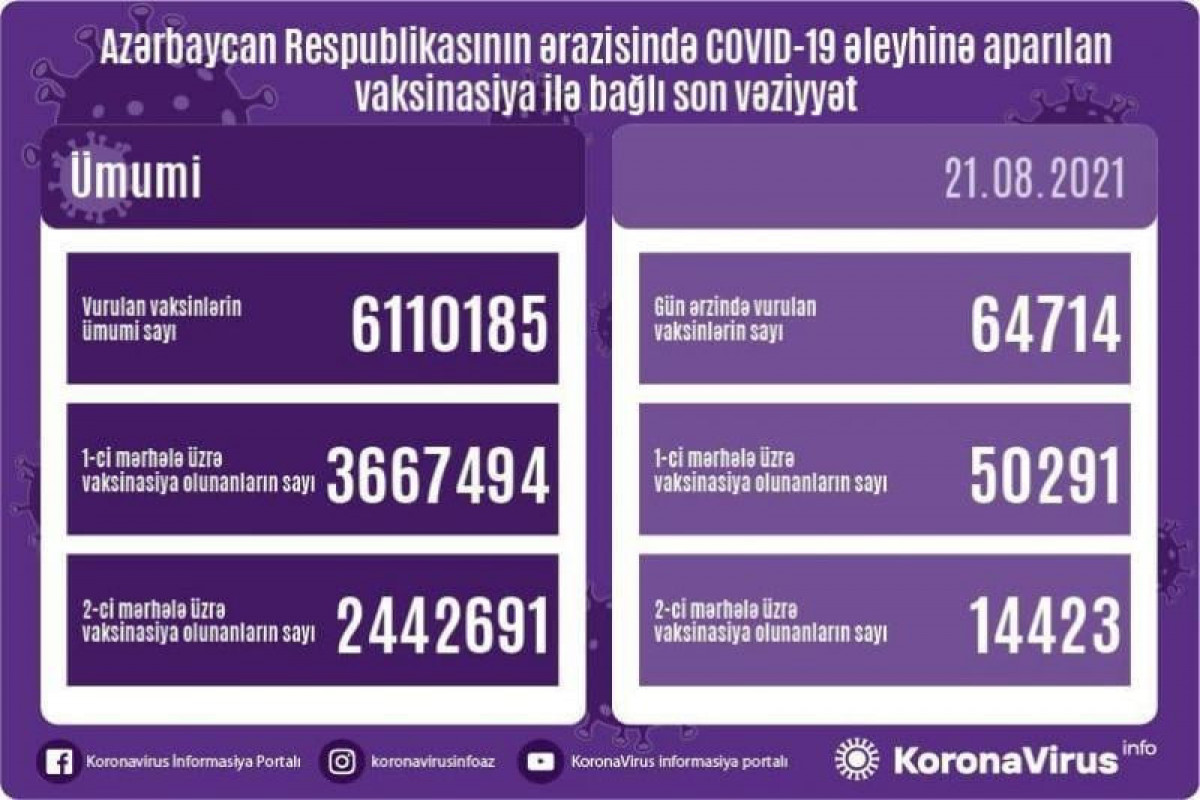 Azərbaycanda son sutkada koronavirus (COVID-19) əleyhinə 64714 vaksin vurulub.