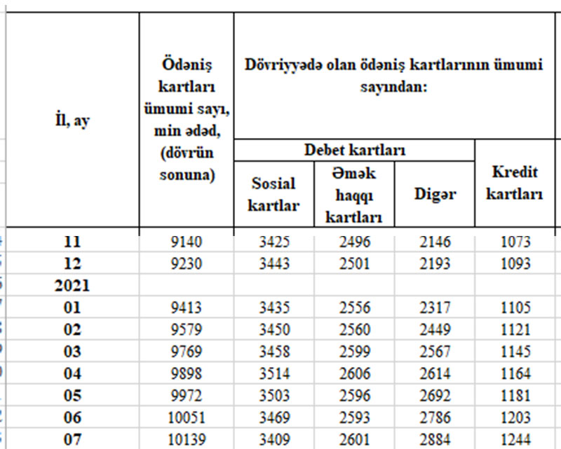 Cari ilin 7 ayı ərzində (yanvar-iyul dövründə) sosial kartların sayı 34 min ədəd azalıb, əməkhaqqı kartlarının sayı 100 min ədəd, sosial və əməkhaqqı kartı olmayan digər debet kartlarının sayı 691 min ədəd, kredit kartlarının sayı isə 151 min ədəd artıb.