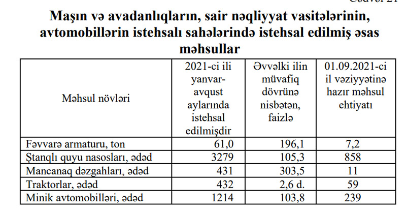 Xatırladaq ki, 2020-ci ildə Azərbaycanda 1949 ədəd və ya 2019-cu illə müqayisədə 411 ədəd az minik avtomobili, 300 ədəd və ya 2019-cu illə müqayisədə 66.9% az traktor istehsal edilmişdi.