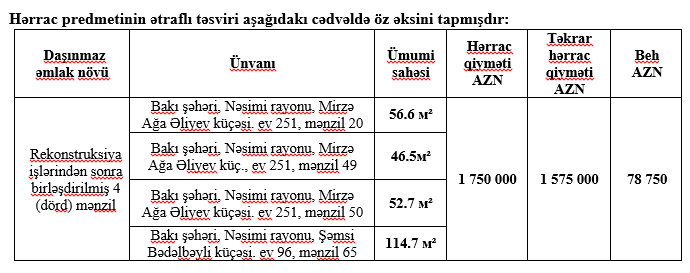 Təkrar hərrac “Əmlak Hərrac Mərkəzi” MMC tərəfindən 21 sentyabr 2021-ci il tarixində saat 11:00-da Bakı şəhəri, Yasamal rayonu M.Rahim 4A ünvanında keçiriləcəkdir.