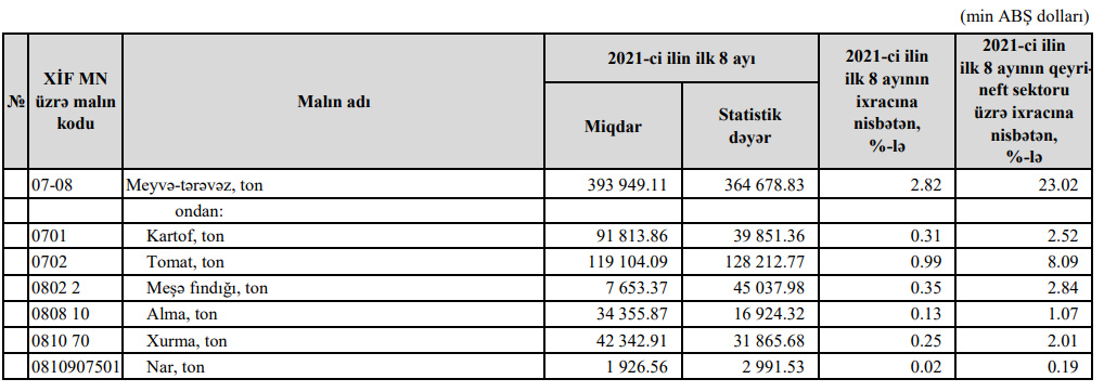 Marja Dövlət Gömrük Komitəsinin aylıq statistikasına istinadən xəbər verir ki, 2021-ci ilin 8 ayı ərzində (yanvar-avqust) Azərbaycandan 39 milyon 851 min dollar dəyərində 91 min 814 ton kartof ixrac edilib. Dövlət Gömrük Komitəsi ixrac az olduğundan 2020-ci ilin 8 ayında kartof ixracı barədə rəqəmləri açıqlamamışdı.