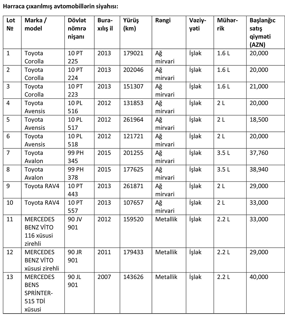 Hərrac üzrə minimal təklif məbləği -Hər lot üzrə müəyyən edilmiş başlanğıc satış qiymətindən aşağı olmamalıdır.