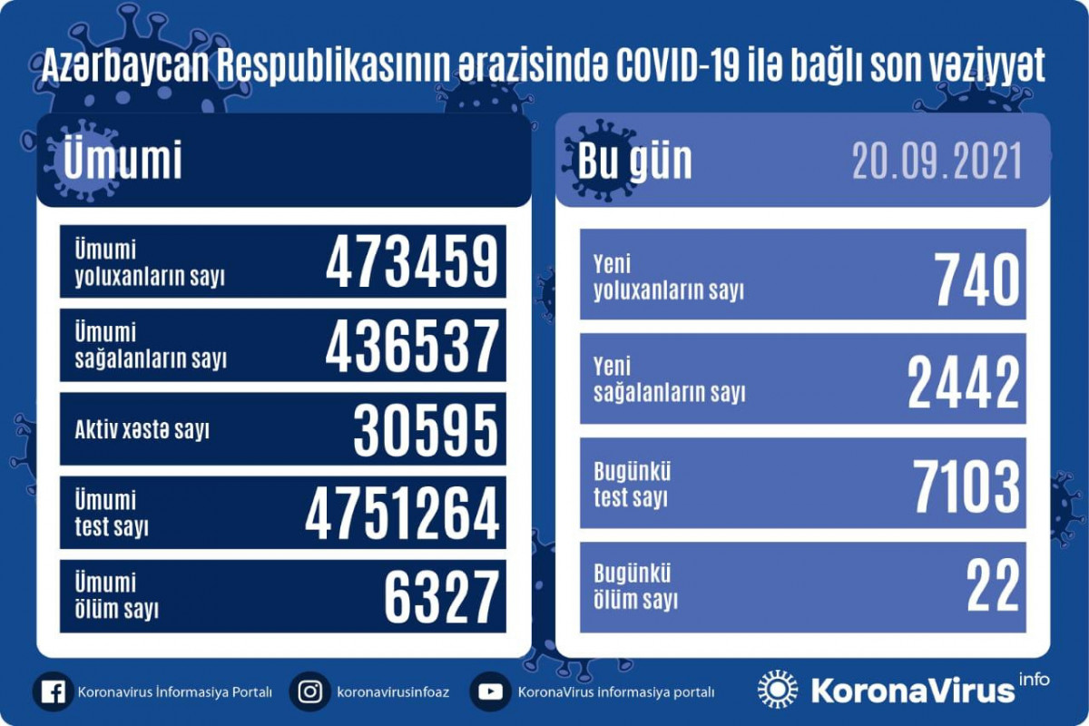 Azərbaycanda son sutkada koronavirus infeksiyasına 740 yeni yoluxma faktı qeydə alınıb, 2442 nəfər müalicə olunaraq sağalıb və evə buraxılıb.
