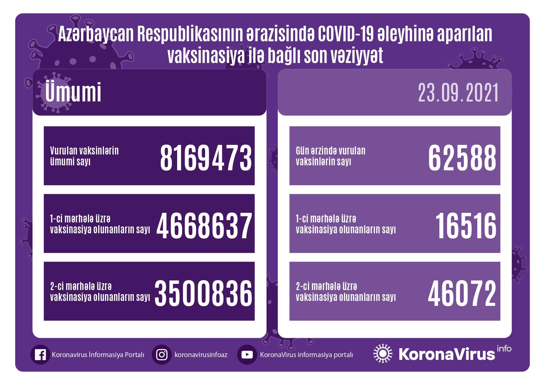 Azərbaycanda son sutkada koronavirus (COVID-19) əleyhinə 62588 vaksin vurulub.