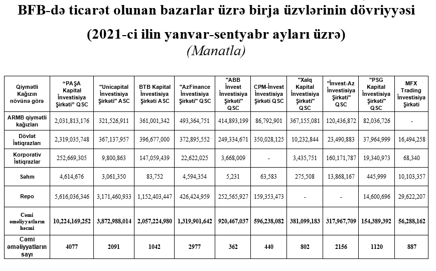 2021-ci ilin yanvar-sentyabr ayları üzrə Bakı Fond Birjasında ticarət olunan bazarlar üzrə birja üzvlərinin dövriyyəsi açıqlanıb.