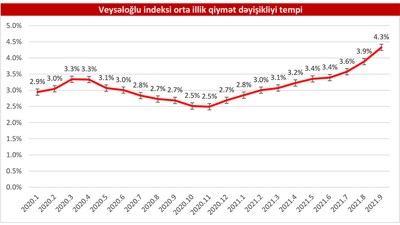 “Veysəloğlu Pərakəndə İndeksi”nə daxil edilən məhsulların qiymətində 2021-ci ilin sentyabr ayında 2020-ci ilin sentyabr ayı ilə müqayisədə 7,7% artım müşahidə edilir. Belə ki, cari ilin sentyabr ayında ötən ilin sentyabr ayı ilə müqayisədə təzə qida məhsullarında (qısa müddətli istifadəyə yararlı istehlak məhsulları) 6,7%, qida və spirtsiz içkilərdə 9,5%, alkoqol və tütün məmulatlarında isə 5,8% artım olub.