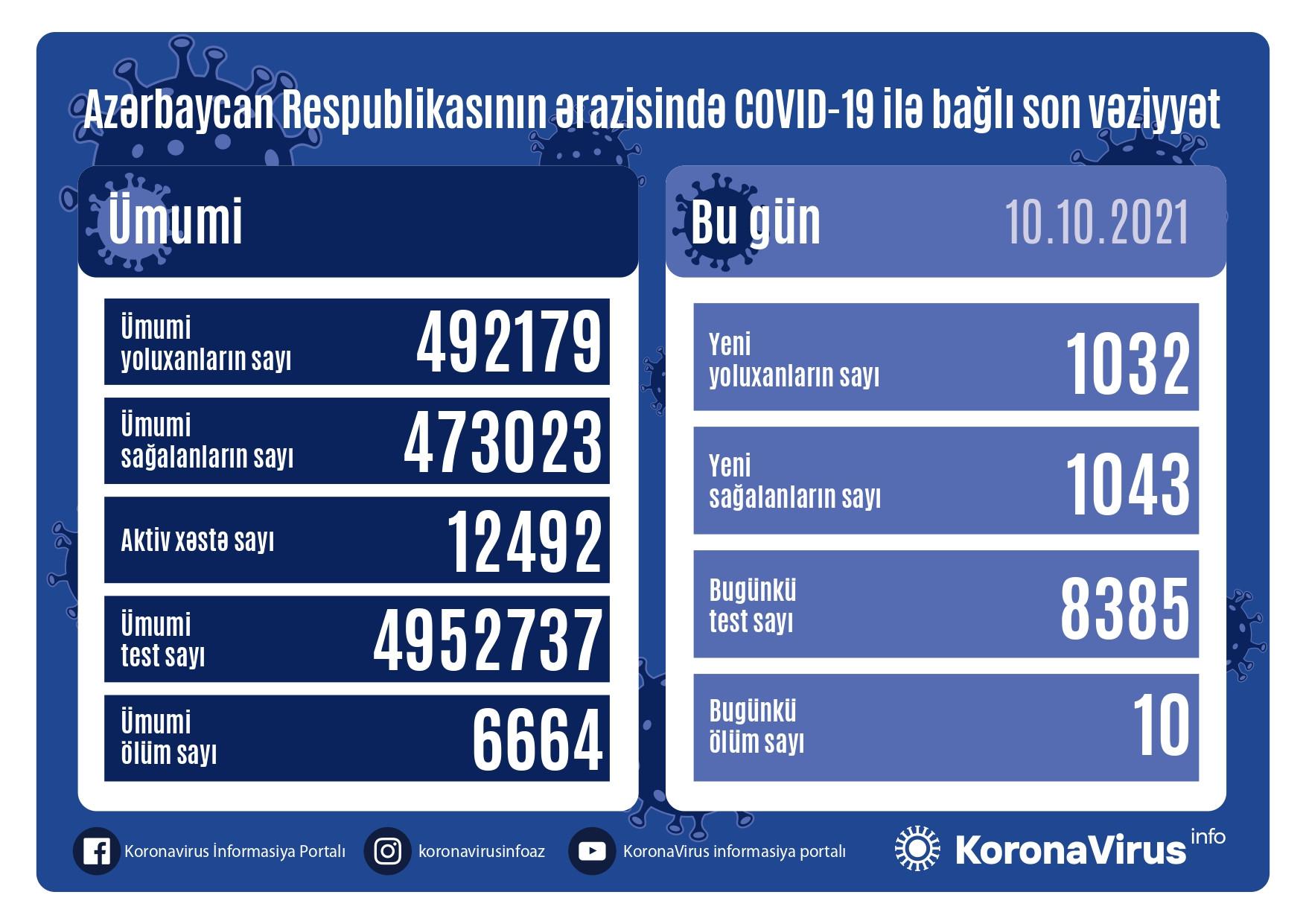 Azərbaycan Respublikasında koronavirus (COVID-19) infeksiyasına 1032 yeni yoluxma faktı qeydə alınıb, 1 043 nəfər müalicə olunaraq sağalıb.