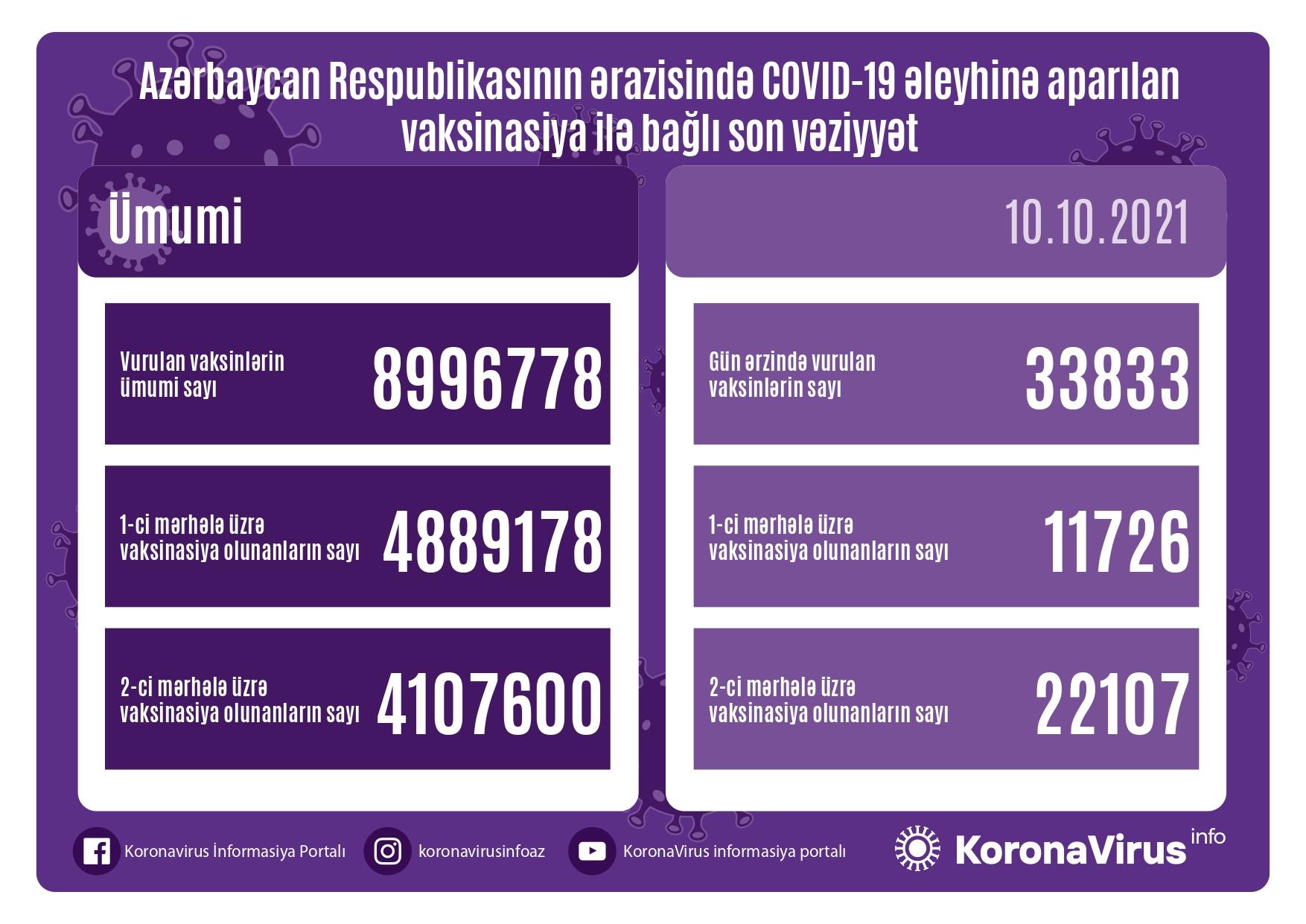 Ölkədə vurulan vaksinlərin ümumi sayı 8 996 778, birinci mərhələ üzrə vaksinasiya olunanların ümumi sayı 4 889 178, ikinci mərhələ üzrə vaksinasiya olunanların sayı isə 4 107 600 təşkil edir.